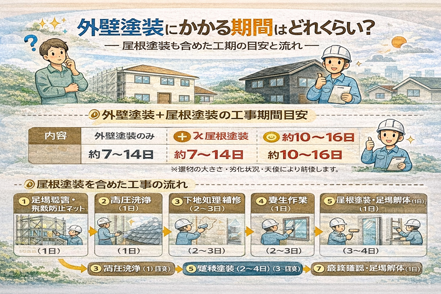 NEW 外壁塗装にかかる期間はどれくら... 2026年02月13日 みなさんこんにちは 外壁塗装のタマオです! 前回は「明るい色・暗い色のメリットとデメリット」 についてご紹介しましたが、今回は 「外壁塗装にかかる期間はどれくらい?」について紹介します♪ &n… 続きを読む >>