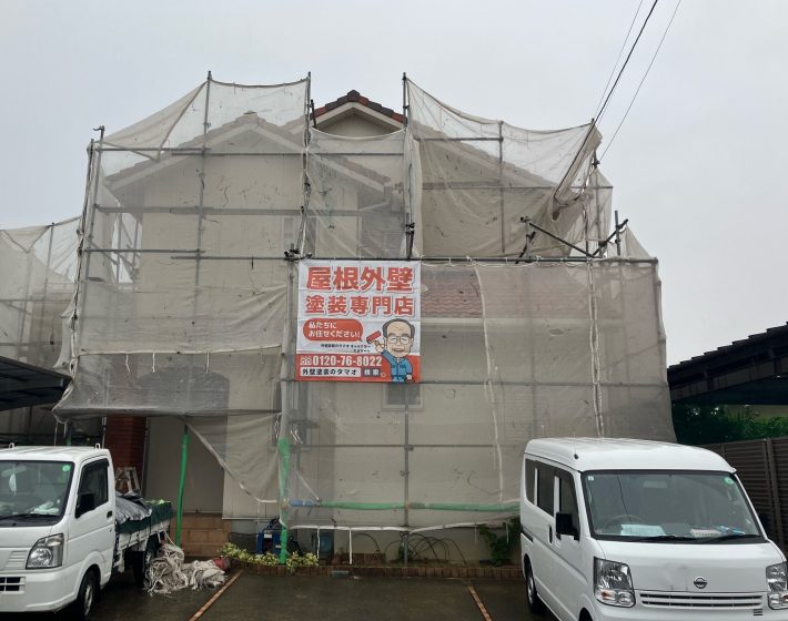 | 工事内容 | 【標準工事】 ・足場仮設 ・飛散防止シート張り ・高圧洗浄 ・下地処理 ・養生 ・下塗り(1回) ・上塗り(2回) ・足場解体 ・清掃 【付帯塗装】 ・雨樋 ・軒天井、ボード ・破風板、鼻隠し ・雨戸、シャッターボックス ・雨切り板板金塗装 ・バルコニー防水 |