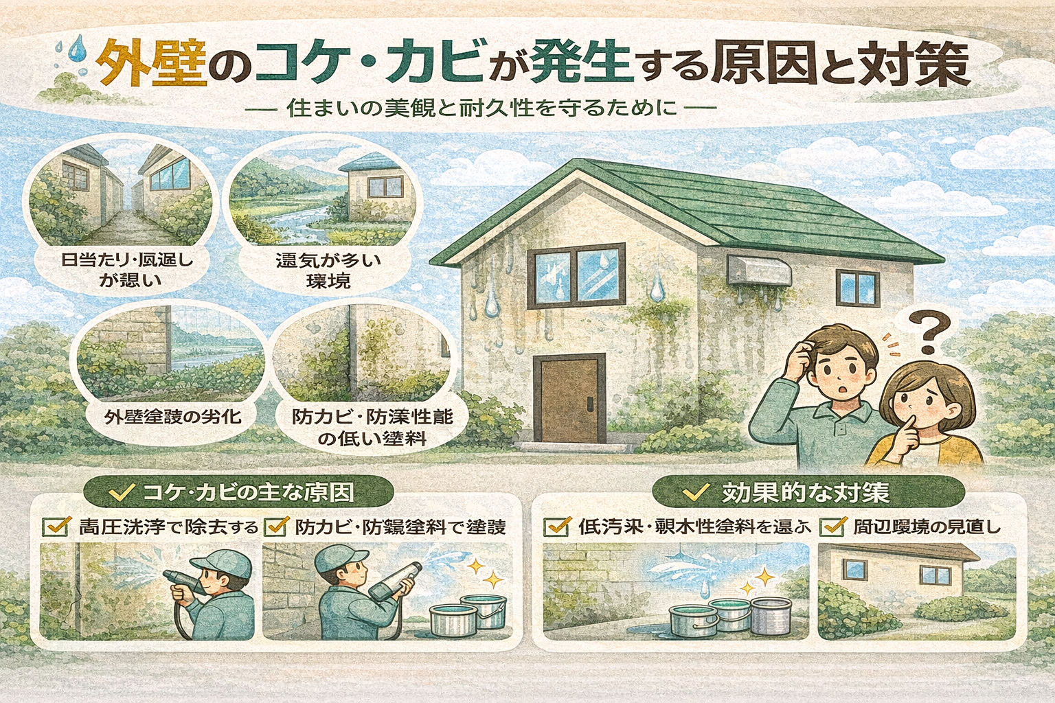 外壁のコケ・カビが発生する原因と対策」について紹介します♪